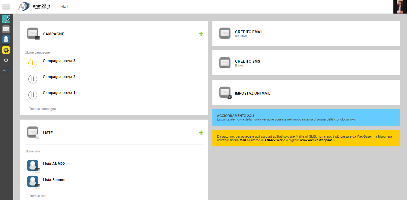 Dal seguente pannello si gestiscono tutte le funzionalità della piattaforma per l’invio delle campagne Newsletter. Nei seguenti punti andiamo a vedere i passi principale per la creazione e l’invio di una campagna.